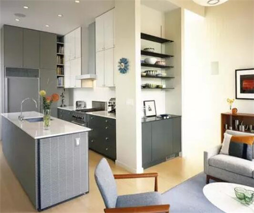 在这类空间设计中,油烟是一个非常重要的问题。中式烹饪方式所产生的油烟较多,如果你想做开放式厨房的话,那油烟机一定要选择吸油性好、功率大的烟机。另外我们还要保证厨房有较好的通风性,这样开放式厨房的油烟味也不会过重,我们在烹饪中油烟也不会进入客厅。