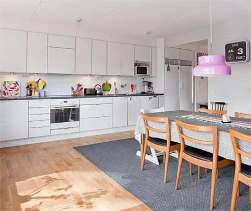 在开放式厨房里,餐桌的布置一般都离厨房较近,因此我们要注意厨房的行走空间一定要足够宽,这样我们在进出厨房时才会更加方便不拥挤。