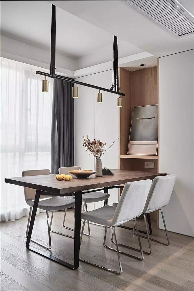 ▲ 铜色吊灯在黑色吊杆下,搭配餐桌上的摆饰,带来一个利落而精致的用餐氛围。